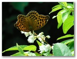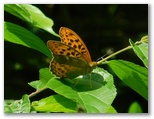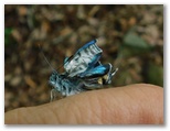 リュックを軽くするため、昼食の携行をやめ、食料はおやつだけです。もちろん、非常食は別枠。ベンチやテーブルのない大ダビ山頂では、立ったままおやつをパクつき、10分ほど休みました。引き続き、高畑山に向かいます。下り始めると直ぐ、尾根が右と左に分かれました。登山道は左、凄い激下りです。雨後はスリップに要注意。この下降中に、美しい青色のシジミ蝶を見つけました。 ゼフィルスです。手に乗せると可愛らしく、しばし時間を忘れてしまいました。