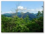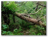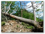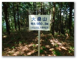 通過後に振り返って見ると、ナイフリッジを渡った方が良かったのかも知れません。この岩場は「大桑岩稜」と言うそうです。まずは無事に標高差約40mを登り返し、940m+の小峰に立つと、道志の朝日山から今倉山あたりまでをきれいに望めました。道志山塊は、東西に長い連嶺で、見えているのはその一部分です。さて、その小峰で倒れていた松の木を越え、また少し下って、大きく登り返すと、大桑山(980m+)でした。展望はありません。山頂標は三つもあります。