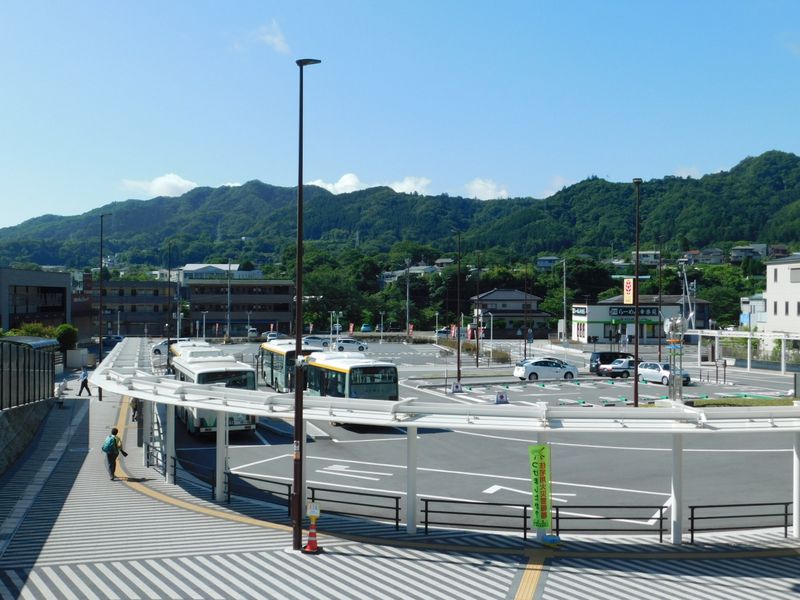 -- 上野原駅南口。広々としたバスターミナル。8:30