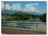 バスが動き出すと、迷いもためらいも消えました。楽しいマイクロバスツアーの始まりです。釜無川左岸段丘をぐんぐん下り、釜無川が見えてきました。ああ、下に見えるあの橋を渡るのだな、とカメラを構え、釜無川橋に差し掛かった瞬間、上流方向をカシャ。このあたりから「むかわ」という名がよく出てきます。実は武川をむかわと読むことに、ここでようやく気付きました。通過していく集落の風情は、どこの田舎にもありそうな家並みだな、という印象でした。