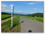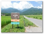 緑も鮮やかな水田地帯に入りました。別世界です。家屋のほとんど見当たらない田園は、遮るものの全くなく、四方の山並みをきれいに見せてくれます。定刻通り、「名水公園べるが東」バス停に到着。料金は200円均一の後払いです。走り去るバスを見送り、ヤマレコの地図を見て現在地を確認。地図がなくても、南アルプスに向かって歩けばいいので、道に迷うような場所ではありません。道わきに立つ看板を見て「べるが」とはVerdant Gardenのことだと知りました。