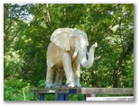 「べるが通り」なる真っ直ぐな道を、山に向かって歩きます。道わきに並ぶアジサイに、花がまだありましたが、このカンカン照りでは色も冴えません。なぜか、モンキチョウばかりが幾つも飛んでいます。左に「名水公園べるが」を遠目に見つつ、ひたすら直進。突き当りの案内板を見て、竹宇駒ヶ岳神社へと向かいます。鎖に繋がれた象の像を見て、またひたすら竹宇駒ヶ岳神社へ。やがて緑陰の道となり、ほっとしました。春や秋なら、もっと楽しい道だったでしょう。
