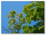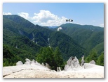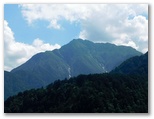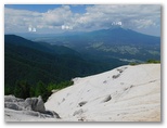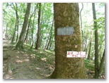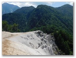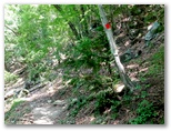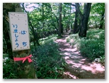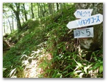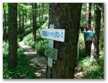 さて、ハイキングコースに花はあまり咲いていませんでしたが、虫はいました。オオスズメバチに似た大型のアブが、ブンブンと五月蝿くまとわりつきます。林相は、広葉樹がメインでしたが、私の好きなカラマツ林も現れ、林床に大きな笹が茂っていました。その緑の笹に埋もれそうな、白くて、足にやさしい登山路。標識の数字にも励まされます。ほとんど無風で、とても暑かったのですが、ジグザグ道が右に折れるたび、谷から上ってくる微風に癒されました。
