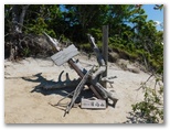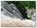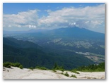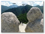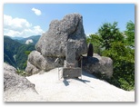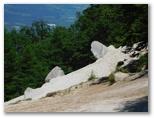 山頂に至る直前、三角点に立ち寄りました。樹木に囲まれて、眺望はありません。ここに三角点を設置したときは、見晴らしが利いたのでしょう。三角点石に表敬のタッチをし、山頂に向かうと、すぐに白砂の空中庭園に飛び出しました。何ともすばらしくドラマチックな山頂です。花崗岩の風化によってできた、ザラメのような白砂。風雪を経て造形された奇岩の数々。向かい合うライオンのオスとメスのような彫刻もあります。加えて広大なパノラマ、青い空、白い雲。