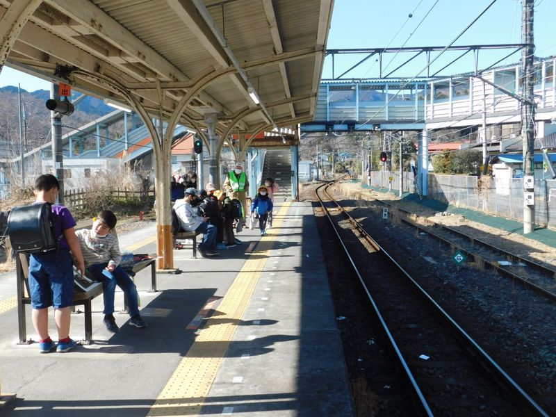 -- 下り電車に乗る児童たち。