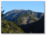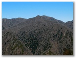 以後は、話を端折ります。シダンゴ山を左手はるか下方に見やりながら、急な尾根を慎重に秦野峠まで下りました。沢を越えて、うんざりする登り返しを我慢します。鹿フェンスに挟まれた隘路を通り抜け、林道秦野峠に到着。ダルマ沢の頭はパスして林道虫沢線を歩き、シダンゴ山に登りました。山頂で檜岳山稜をもう一度とっくりと眺めます。ここでバスの時間調整を兼ね、ベンチで大休止。ホットカルピスは固形化が始まり、飲むヨーグルトのようになっていました。
