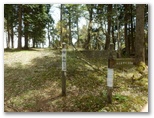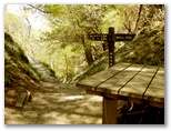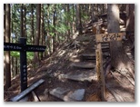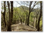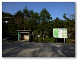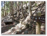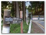 引き返してゲートを通過。管理棟で登山届けを書いて提出。掲示板を見ると、「今週の見ごろ(5月7日)」として、トウゴクサバノオ、ムササビ、ヒガラなどの名があり、楽しみです。「やどりき水源林案内図」「多彩な広葉樹林をめざして」なども、ちょっと勉強になりそう。途中でトイレに寄り、管理棟から15分ほどで、登山道の入口にやって来ました。いくつもの標識が立っています。ここは「恵水の森」、その先に「成長の森」、そしてさらに先に「雨山峠」があります。