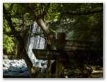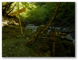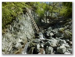 渡渉を5回すると、右岸に木製の梯子が掛けてありました。がっちりして、不安はありません。上り終えると、目にも鮮やかなヤマブキが咲いていました。木の桟橋の架かった山道を進みます。梯子から5分ほどで、釜場平と書かれた、休憩所がありました。涼し気な場所で、ベンチ兼用テーブルが二つあります。リュックを下ろして、しばし小休止。冷たい麦茶を飲みます。ここまで順調にやって来れましたが、この先はどうでしょうか。山を侮って油断してはいけません。