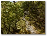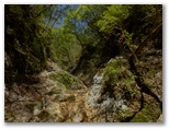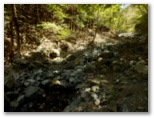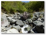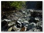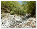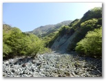 この黄色い鉄製道標は、その後も渡渉点や分岐点などに、すこぶる親切なほど頻繁に現れました。良い意味で期待外れです。道標は多く、沢の水量は少なく、晴天で見通しは極めて良い。初めて来た道を、最良の条件下で歩けるのは幸いです。こんな好条件の日ばかりではないでしょう。広々とした明るい川原。眩しい日差しと心地よいそよ風。四方八方、山は緑、谷も緑。童心に帰って、じゃぶじゃぶ歩きをしたいような気にもなる、自然が優しさを見せる日和でした。