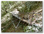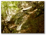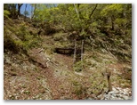 釜場平から10分ほどで、涸れた沢を横断しました。これがコシバ沢のようです。右岸まで行くと、「コシバ沢方面危険」「雨山峠〇← →コシバ沢(危)」と書かれた標識がありました。雨山峠を目指して、左のトラバース道に進みます。10分ほど行くと、斜面のザレ場がしばしば現れるようになりました。崩れた石積み道、ロープ場、鉄パイプ桟道、鎖場などが続きます。次の沢に下りると「雨山峠0.6km」の道標があり、いくつかの木橋が流されたままになっていました。
