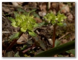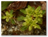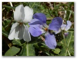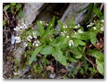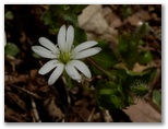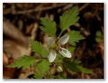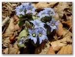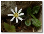 ここは一見メルヘン的な尾根道のようでしたが、左右が鋭く切れ落ちていました。足下をしっかり見て歩きます。気が付くと、右手に同角ノ頭の三角峰、後ろに丹沢主稜。目を凝らすと、蛭ヶ岳山荘も見えました。間もなく急登に差しかかりましたが、標高も心も同時に高揚して、足どりは軽やか。すぐに急登は終わり、尾根幅がぐんと広くなりました。ランラン稜線漫歩の始まりです。みずみずしい緑の草はトリカブト、青紫の花はフデリンドウ、白い小花はハナネコノメ?