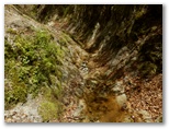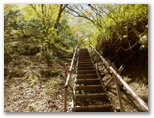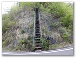「雨山峠0.5km」で右岸の鉄階段を上ると、小さな乗越があり、また涸れ沢(寄沢本流?)に下ります。「雨山峠0.4km」あたりからミツバツツジの花を仰ぎ見つつ沢床を進み、「雨山峠0.3km」から狭いV字谷に道が続いていました。二俣の手前、「雨山峠0.1km」の道標がワイヤで吊るされています。これを見て左の沢に進みますが、そこは道があるような、ないような狭い沢床。増水時は難儀するでしょう。最後に、崩落した桟道に代わる鉄階段を上ると、雨山峠が見えてきました。