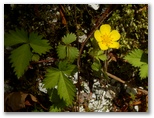 ようやく雨山峠に着き、ほっとしました。ここはいかにも峠らしい十字路。頼もしげな道標とベンチ兼テーブルがあります。黄色の小さな花は、ツルキンバイでしょうか。たくさん咲いています。空腹になったので、お茶とおやつにしました。胃袋からも幸福感が上がって来ます。新緑の木々を眺めると、空の青さが若い緑を引き立てていますが、まもなく緑が繁って空を埋めてしまうのでしょう。次はいつ来るか、二度と来ないか、雨山峠の一期一会。今を目に焼き付けます。