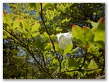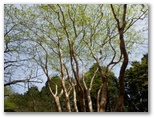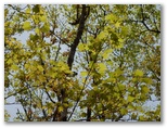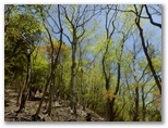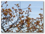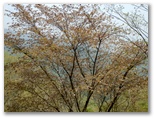 檜岳へは、一旦階段状の道を下ります。鞍部にミツバツツジがありましたが、1本は満開、その隣の1本は花が完全に終わって、三つ葉が開き始めていました。実生なので個体差があるのでしょう。その先を緩やかに登り返すと、カラマツ越しに蛭ヶ岳が見えるようになり、もう檜岳の山頂でした。最高地点は、山名標柱からやや離れた三角点のさらに先かと思います。すみれに気を付けながら腰を下ろし、お茶にしました。モミジの赤い新芽、マメザクラの白い花があります。