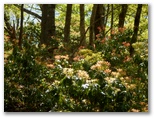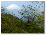 雨山に向かいましょう。短い木の梯子を上ると、長く続く尾根歩きが始まりました。赤や黄色に彩られた花壇のように見えるのは、新芽を吹き出したアセビの茂み。その近くで赤紫の明るいミツバツツジが本物の花盛り。おお、富士山が見えます。裾が消えて、あたかも白い山が魔法で空中に浮かんでいるみたい。おや、五枚葉の先にちょっぴり紅を差したゴヨウツツジ。これはシロヤシオです。花は咲き始めたばかり。残念ながら、つぼみはあまり多くありませんでした。