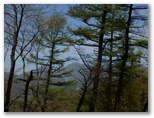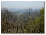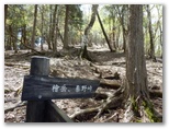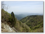 ブナやヒノキの混交林を気持ちよく歩いて行くと、雨山の山名標柱が立っていました。どこが最高地点なのか判りにくい山です。南面が開けていますが、遠方は霞んでよく見えませんでした。この日は黄砂の予報が出ていましたが、これは水蒸気による霞でしょう。行く手には、檜岳と伊勢沢ノ頭とが双耳峰のように並んで見えます。ところで、各道標に檜岳と林道秦野峠の名は出てきますが、檜岳山稜の最高峰である「伊勢沢ノ頭」は、何故かその名が出てきません。