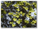 檜岳から伊勢沢ノ頭にかけて、庭園のような美しい林相が続いていました。カラフルな葉をつけたカエデ、10本足のイカを逆さにしたようなヒメシャラ(たぶん)、庭師が設計したかのような築山とミニカール、秋の紅葉はさぞ美しいだろうと想像されます。その圧巻はカエデ並木。イタヤカエデでしょうか、葉緑素が未だ葉の先端まで行き渡らず、薄オレンジ色の縁取りがおしゃれです。北面が開けた場所では、迫力ある丹沢主稜を望めました。