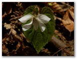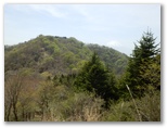 雨山山頂は素通りし、檜岳に向かいました。ポツポツと咲くすみれをのぞき込んだり、カエデやブナの新芽を眺めたりしながら、緩い起伏を越えて行くと、南面に大きな崩落地がありました。空気が澄んでいれば、大展望地だろうと思います。目の前の檜岳を除き、山々が霞んでいるのが残念。他方、北面は順光のおかげで、同角ノ頭、檜洞丸と石棚山稜を、まずまず明瞭に望めました。首が無いに等しいタンポポの花、仏炎苞がはためくマムシグサ。ここは風の通り道です。