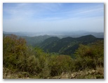 秦野峠に下ります。好展望の尾根をぐんぐん下って行くと、箱根連山や、これから行くシダンゴ山、左手はるか大山と重なる三ノ塔などを望めました。シダンゴ山は山頂広場が草原のように見えます。見つけやすいのですが、その遠さに気が滅入りそうになりました。でも行くしかありません。「一歩一歩進めば、いつか着く」普通は登りで自分に言い聞かせる言葉を、下り道でつぶやきます。転倒しないように足下に注意しながら無心に下り、秦野峠に到着しました。小休止。