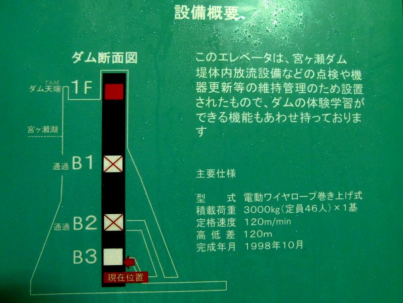 -- エレベーター(無料)でダム天端(てんば)に昇る。