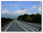乗り心地の良い観光バスで行けるのかと思ったら、入線したのは、普通の路線バス用の車両でした。同時刻に発車する須走口五合目行きのバスも同じです。私は景色の良く見える、最前列左の高い席に座りました。バスが中央青少年交流の家を過ぎて、長い直線道路に入ると、正面に富士山が姿を表しました。よし、やった! きょうの判断は「当たり」です。もしハズレだったら、それは天気予報のせいにしましょう。山の天気の予想は、しばしば賭け事と似ています。