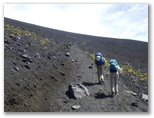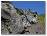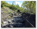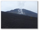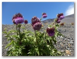 いよいよ火口に下りて行きます。「足元注意」の標識にも促され、ていねいに足を運んで行きました。でも特に危険な道という訳ではありません。途中、フジアザミの株があり、大きな花が10輪ほど咲いていました。偉大な頭脳を持つ人が、謙虚に頭を下げているようです。火口底に近づくと「落石多発 厳重注意」と書かれた標識がありました。火口の上縁から転げ落ちて来る岩石がないか、注意しながら歩きます。ロープが張られ、火口底の中心部に立入ることはできません。