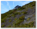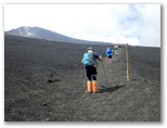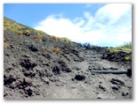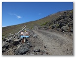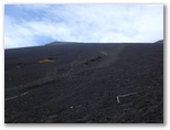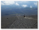 さて行く手には、御殿場口新五合目まで続く長い道が、鮮明に見えています。下山路を示す白木の棒が点々と立てられ、白いロープが棒から棒へとつながれています。視界の悪い日には、このロープが大いに役立つのでしょう。下山路と登山路が最接近するところで、御殿場ルートを登る人々と出会いました。富士登山の4ルートのうちで、五合目から山頂までの標高差が最も大きく、骨の折れるのが御殿場ルートです。そこを黙々と登る人たちの姿が勇ましく思えました。