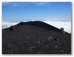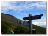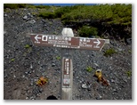 「く」の字の屈曲部から、ますます強くなった風を、右後方から受けるようになりました。先ほどのお父さんは、ここで逆風を受けながら、よく頑張ったことと思います。馬の背に近づくと、宝永山頂への近道が右に分岐しますが、ここに道標の類はありません。私はもちろん近道を進みましたが、ここからが最も風の激しい区間でした。ようやく稜線に立つと、今度は風で体が飛ばされそう。風上に体を倒し気味に歩いて、きょうの目的地、宝永山頂に達しました。