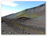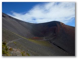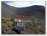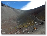 五合目から正味15分ほど歩いたら、早くも六合目でした。標高差にして110mほど登っただけです。雲海荘と宝永山荘の二つの山小屋の前を通ると、富士宮ルートを左に分け、宝永山遊歩道に入りました。ここからは、人の数が激減します。やや下り気味のトラバース道を、マイペースで気分良く歩いて行くと、10分も行かぬうちに宝永第一火口縁に到着しました。宝永山とその大きな火口を一望できる、すばらしい展望地です。311年前、正にここで、大爆発が起こりました。