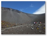 風を避け、東面に10mほど下ったところで、昼食の代わりに行動食を摂りました。両足にゲーターを着けます。馬の背にもう一度戻って、宝永山にさようならを言い、大砂走りへと踏み出しました。「大砂走り」は、御殿場ルートの下山道です。須走ルートの「砂走り」にあるような角張ったゴロ石がほとんどないので、思い切りザーック、ザーックと駆け下りて行きました。多少はブレーキもかけないと、スピードが出すぎます。みるみる高度を下げて行きました。