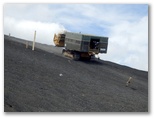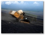 ブルドーザー道との交点を過ぎて少し下った時、ふと思いました。「この山行はもうすぐ終る。少々あっけない!」と。そこで、二ツ塚に登ってみることにしました。交点まで引き返します。わずかな距離ですが、大砂走りを登るのはけっこう大変。その交点まで戻ると、ブルドーザーを改装した運搬車が下りてきました。「山頂公衆トイレ・物資運搬車両」と書かれています。費用のかさむヘリでなく、ブルが使える富士山は、まだありがたいと言えるかも知れません。