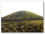 交点に立つ道標を見て、須山口下山歩道に入りました。山腹を斜めにトラバースして行く、明瞭な踏み跡があります。行く手に人影は全くありません。見渡す限り、イタドリ、フジアザミ、オンタデなどの咲くお花畑。ちょっと地味ですが、そこは富士山ならではの広大な夢空間! きょうは私ひとりの貸し切り状態ですが、足に余力のある方にはぜひお奨めします。もちろん、砂ぼこりなどありません。そして、先ほどから見えていた二ツ塚が、どんどん近づいてきます。