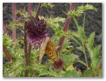 二ツ塚は、文字どおり二つの小山で、双子山とも呼ばれます。上にあるのが上塚で、下にあるのが下塚と、呼び名も単純。私は、須山口下山歩道の二合五勺を過ぎ、道が上塚から少し離れ始めた地点から上塚に向かいました。登山路のようなものが幾つか見えますが、向かって最も左のものが登りやすそうです。裾から山頂まで、10分ほどで登れると思ったのですが、途中で花や蝶と出遭ってしまいました。イワオウギ、イワツメクサなど、きょうは初めてここで目にします。
