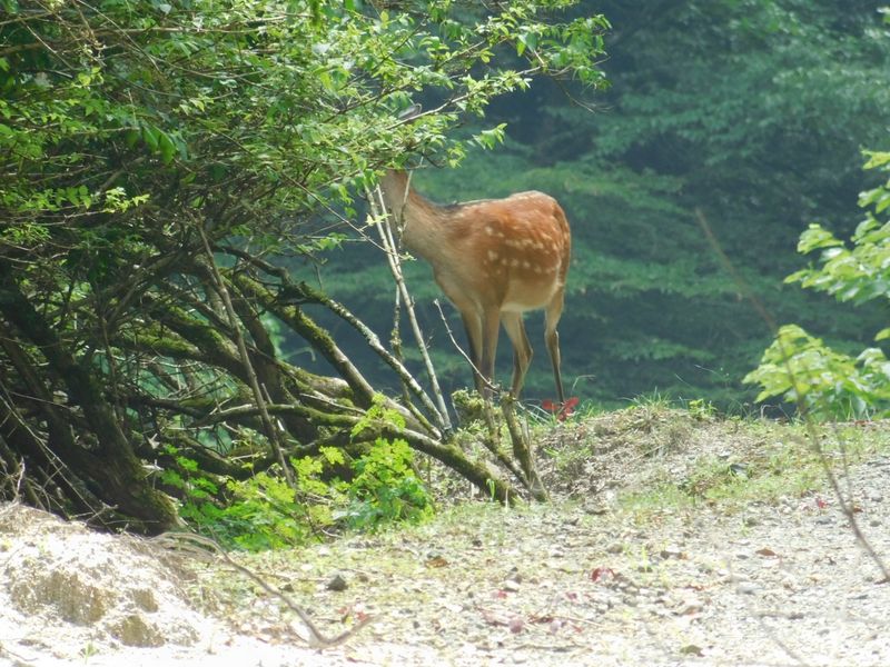 -- シカが木の葉を食べている。
