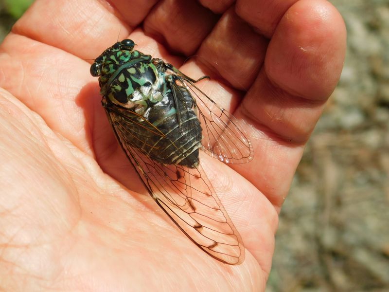 -- 地面にいたミンミンゼミ♂:右前翅がない。