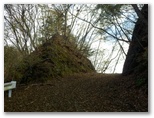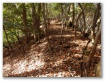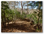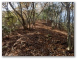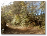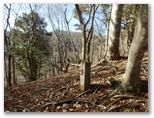 水沢橋から、なおも水沢林道をテクテク、音見沢を越え、焼小屋沢(やきごやざわ)を越えて行きます。正味1時間ほど歩くと、切通しにやって来ました。これから登る伊勢沢左岸尾根の尻尾切りです。切通しから西方に100mほど行くと、北面に東海自然歩道の通る稜線を望める場所があり、ここで林道の右から尾根が立ち上がっていました。地図と照合し、ここから伊勢沢左岸尾根に取り付きました。