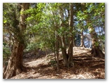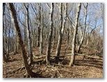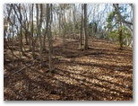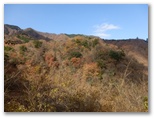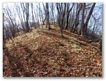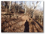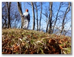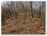 石標から5分ほど登ると、尾根の幅が広がり、明るい日差しの降り注ぐ、すてきな尾根になりました。さらに5分ほど登ると、尾根幅がとても大きく広がり、葉を落とした中低木がまばらに立って、山上庭園のようになりました。落ち葉をサクサクと踏みしめながら、のんびりと登って行きます。しばらく寝そべって行こうかな。でも先ほど休んだばかりだし、まあ、ゆっくりと歩いて行こう。サクサク、時間はたっぷりとあります。きょうは、ここに来て、本当に良かった!