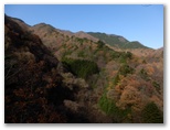 尾根には濡れた落ち葉がびっしりと敷き詰められ、はじめは滑りそうに思いましたが、立ち木がたくさんあるので、安心して登れました。そのうち日が差してきて、気分は上々に。地形図に650mの等高線が小さな楕円を描く峰に達すると、行く手の711m峰がはっきりと姿を現しました。「セブン・イレブン」と勝手に命名します。空は真っ青、山は紅葉色。隣の尾根や、そのまた隣の尾根も、きれいです。いずれ機会があったら歩いてみたいと思います。