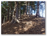針葉樹林を抜けて、再び明るい落葉樹林になりました。足がどんどん前に進みます。やがて尾根の傾斜がほとんどなくなって、東海自然歩道を横断しました。あと少し、尾根の頂点まで登り詰めます。その頂点は、平丸分岐の北東、約200mにある、なだらかな小峰で、地理院地図(電子国土)の標高表示よれば、1165mです(誤差あり)。水沢林道より取り付いてから2時間半、伊勢沢左岸尾根を完登(?)しました。