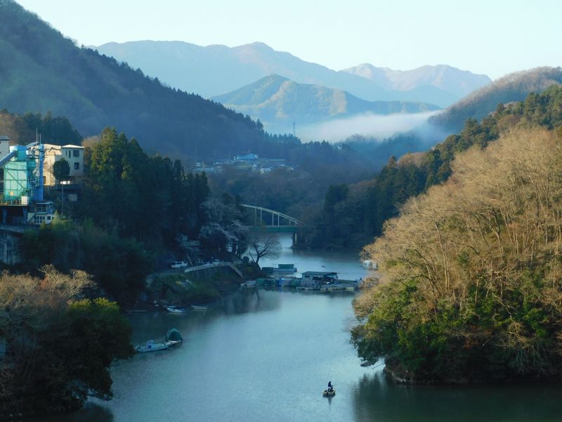 -- 秋山川の彼方に丹沢山塊。川に釣り人。6:24
