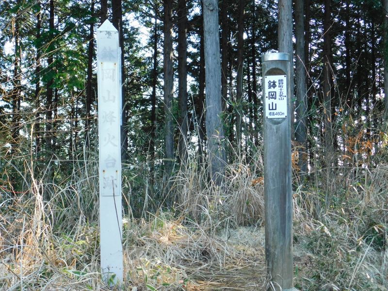 -- 鉢岡山に登頂。左の名標は「鉢岡山烽火台跡」。8:03