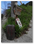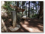 常福院の正門から下山します。手すりのある石段を下りきると道標があり、左は成木バス停、右は軍畑駅となっています。2014年4月に、都バス[上成木-河辺駅北口]線が廃止されて以来、成木方面に下山してからのバス便は、ほとんど利用できないものになりました。道標を見て、安易に下山予定地を変更してはいけません。また、なちゃぎり林道を歩いて永栗ノ峰に行くには、軍畑方面に7分ほど歩くと立っている道標を見て、「林道を経...」と書かれた方向に進みます。