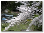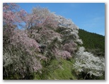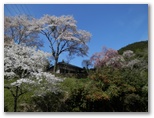 川井駅から終点まで自由乗降区間ですが、八桑登山口はバス停の正面です。乗って来たバスを見送り、登山口に行くと、古風な石の道標がありました。「右ハちヽぶへ 左ハ山へ」と彫られています。岩茸石山へは右ですが、昔の人は名坂峠を越えて、秩父地方へ行き来していたのでしょう。やや急な坂道をゆっくりと登って行くと、桃、白、黄、緑に彩られた集落を望めました。満開のソメイヨシノがあったので、その小枝を揺さぶってみましたが、花は散りませんでした。