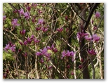 八桑から正味1時間かけて、名坂峠に到着しました。山頂へは、直行すれば10分弱の距離です。でもここからは「山草の道」という愛称で呼ばれる道。私には「道草の道」になりそうです。山頂に向かうと、さっそくカタクリが咲いていました。「こんにちは、カタクリさん。春ですね。」そして山の肩を左に曲がって行くと、後ろから声なき声に呼び止められました。振り向くと、ピンクのツツジがあります! 見晴らしのよさそうな場所に、アカヤシオが咲いていました。