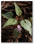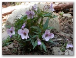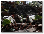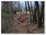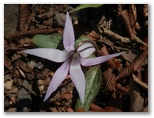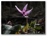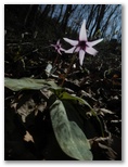 さて、心を満たされて、もう目の前の山頂に向かいます。すると北斜面にカタクリの群落が見られました。分布はまばらですが、自生範囲はかなり広そうです。観察路のようなものはないので、下りて行って撮影することはできません。敢えて下りて行けば、群生地を荒らしてしまうでしょう。なぜか、カタクリは皆、谷側を向いて咲いています。登山道に近い花に、ようやく腕を伸ばして撮影するも一苦労。ここでは大きな一眼レフより、軽いコンデジかスマホが有利です。