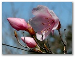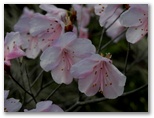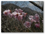 行ってみると、そこは断崖の上。咲いている木は1本だけのようで、花数も多いとは言えません。でも労せずにアカヤシオと出会えました。腰を下ろして、しばし花見の時間とします。5分ほど見ていたら、何と、曇り空が晴れて、花が輝きを増してきました。初々しい乙女の頬のような彩色、世俗から遠く、好んで岩と石の山に咲くアカヤシオ。こんな人に気づかれにくい場所に咲いていることで、いっそう気高く感じられます。