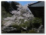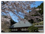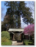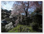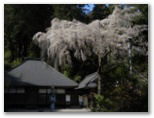 平溝の里も春爛漫でした。高源寺のソメイヨシノ、平溝川のせせらぎ、水辺の若草、慶徳寺周辺の花模様など、各所で思う存分に道草を食って、軍畑駅にゴールインしました。次の青梅行き電車まで17分。よし、東光寺の枝垂桜を見に行きます。駅から片道5分ほどでしょう。萱葺き屋根の家を左から巻き、歩行者専用の踏切を渡って石段を上ります。簡素な門をくぐると、六地蔵の向こうの奥まった場所に、山を背にした東光寺と枝垂桜とが静かに佇んでいました。