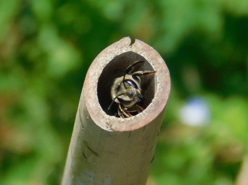 -- ハキリバチ:葉の切れ端を運び入れて、出てきた。