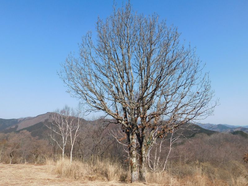 -- 山頂下の広場に立つカシワの高木。9:32