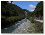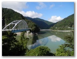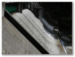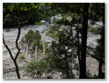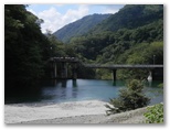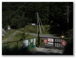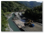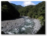 法行橋から5分ほどで、法行沢林道を左に分けました。更に5分ほどで、東京電力の大又沢ダム。水門から溢れた水は、白いレースのカーテンのように、きれいな波模様を描いて滑り落ちていました。ダム湖の湖水は、見る方向によって、深い緑色から白色味を帯びた青緑色まで、ちょっと神秘の味わい。このダム湖にも白い砂が堆積していました。